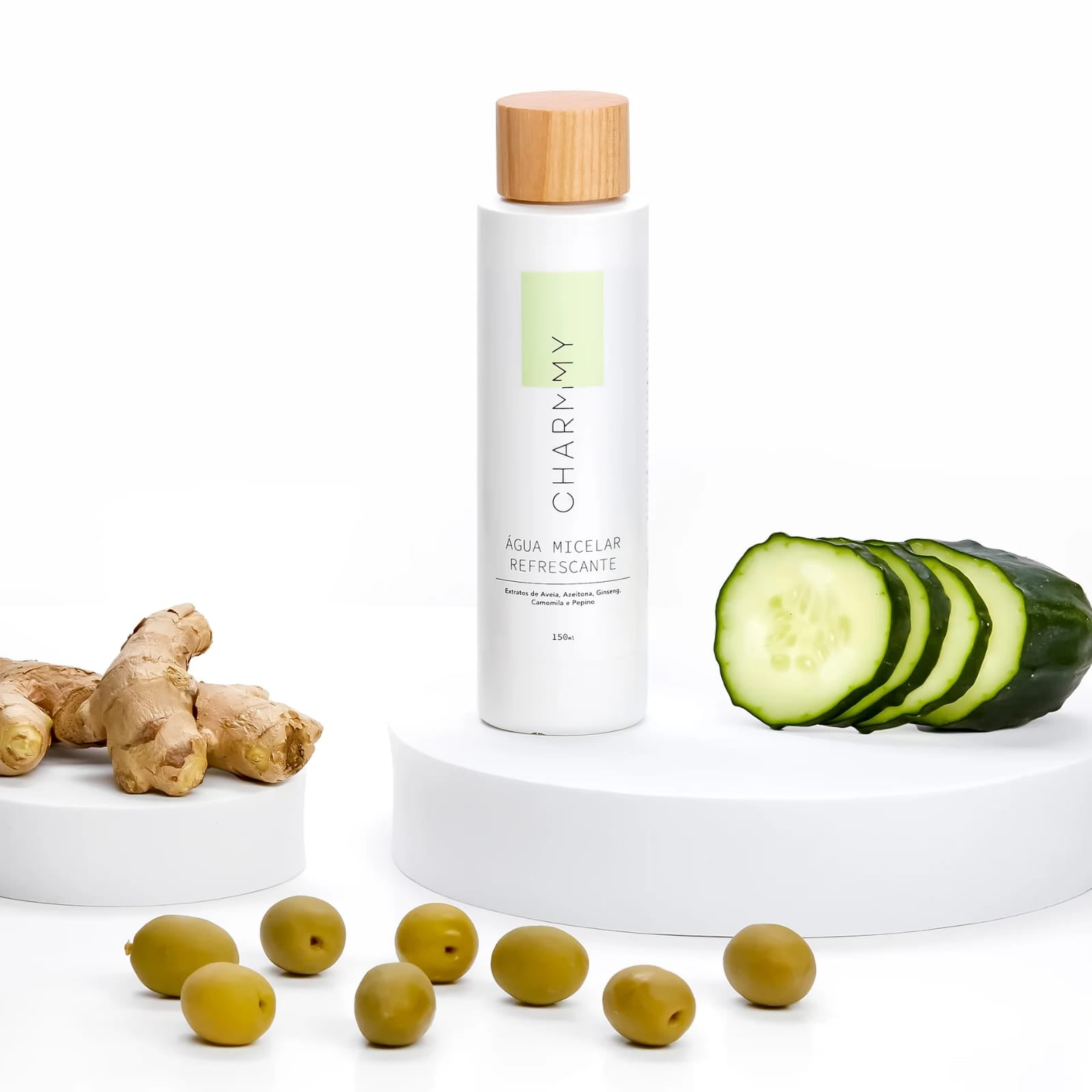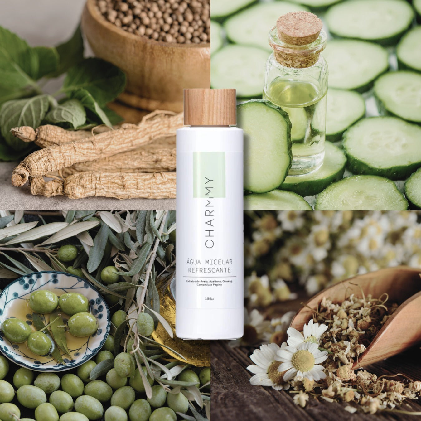 Camomila e Pepino: conhecidos por suas propriedades calmantes, refrescantes e anti inflamatórias ajuda a reduzir a vermelhidão e promove uma pele suave e equilibrada.