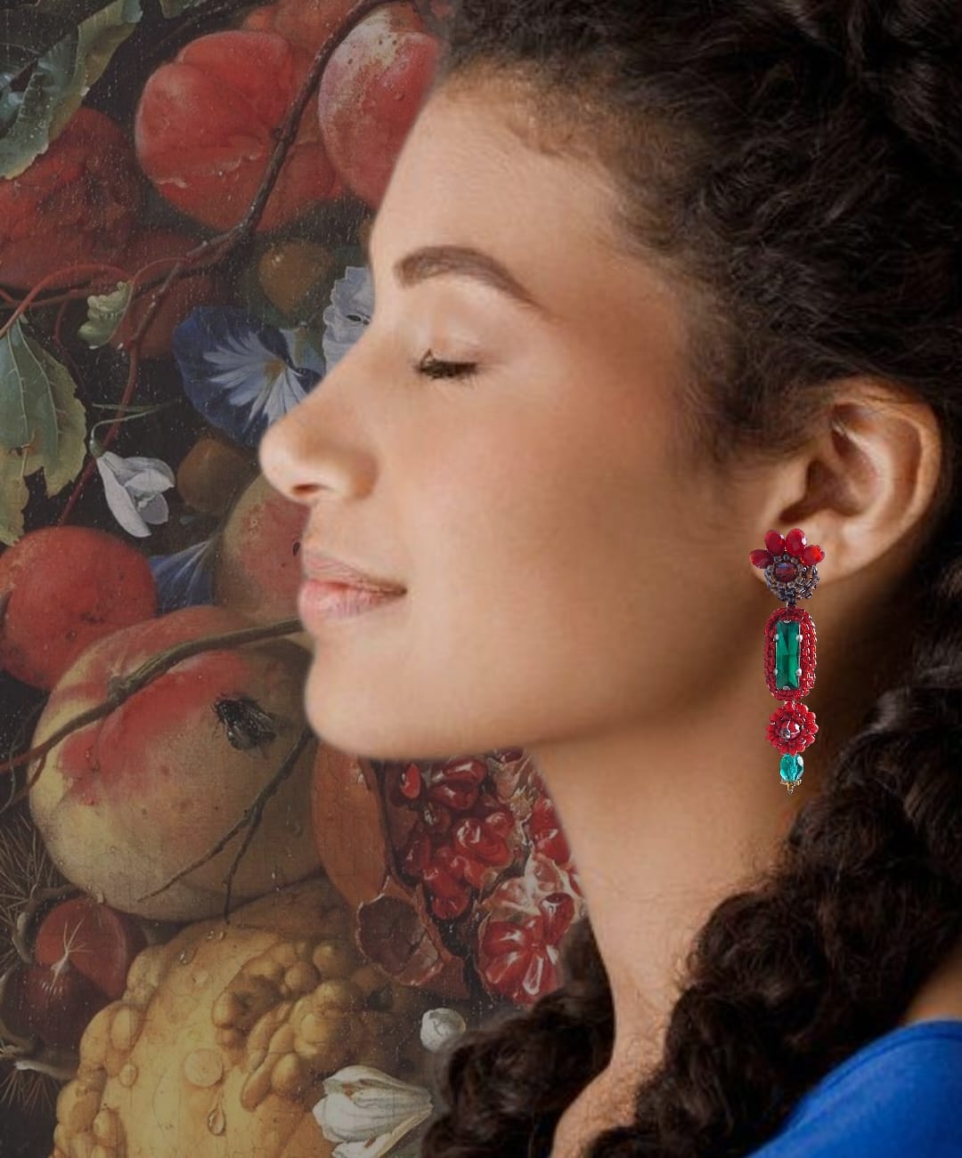 Os brincos artesanais Opora da Iluztro são uma celebração da cor e do detalhe, pensados para quem gosta de acessórios marcantes e cheios de personalidade. Cada par é produzido manualmente em Portugal, onde missangas vermelhas e cristais verdes são bordados em tecido, recriando o charme das peças antigas de joalharia.