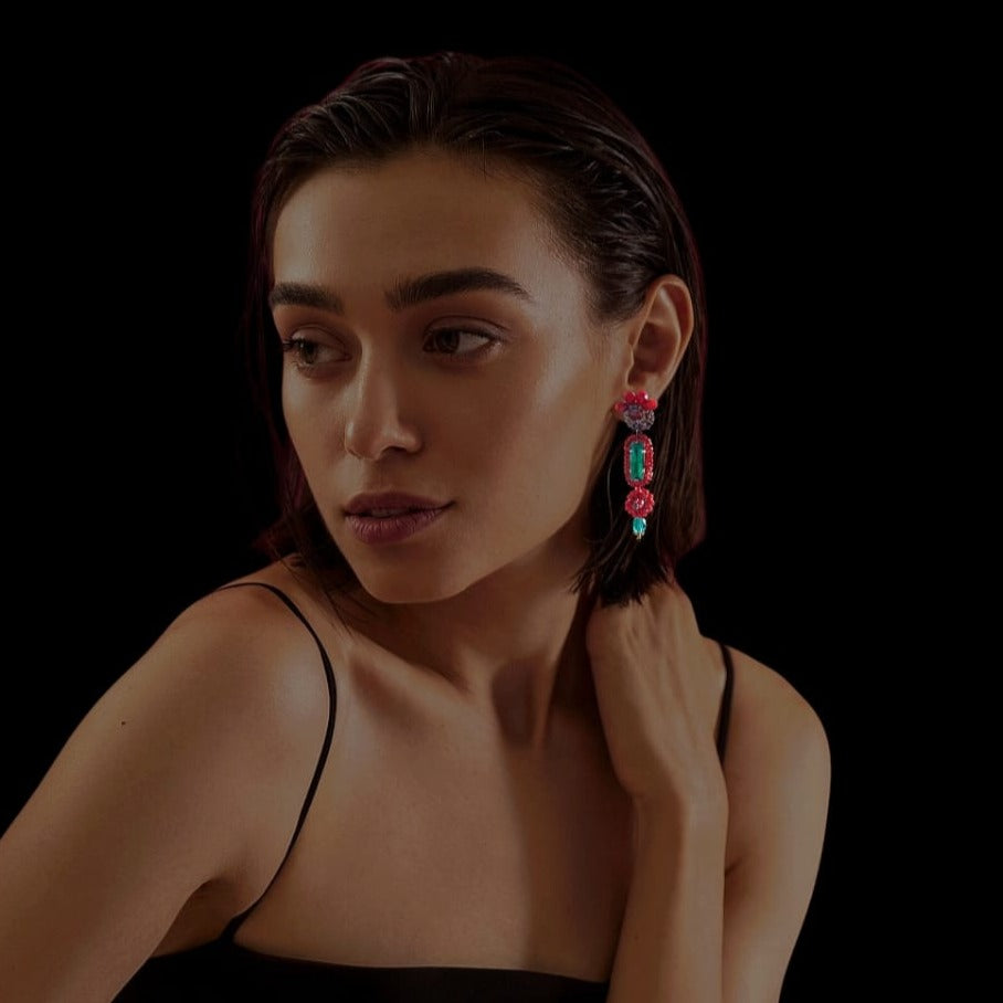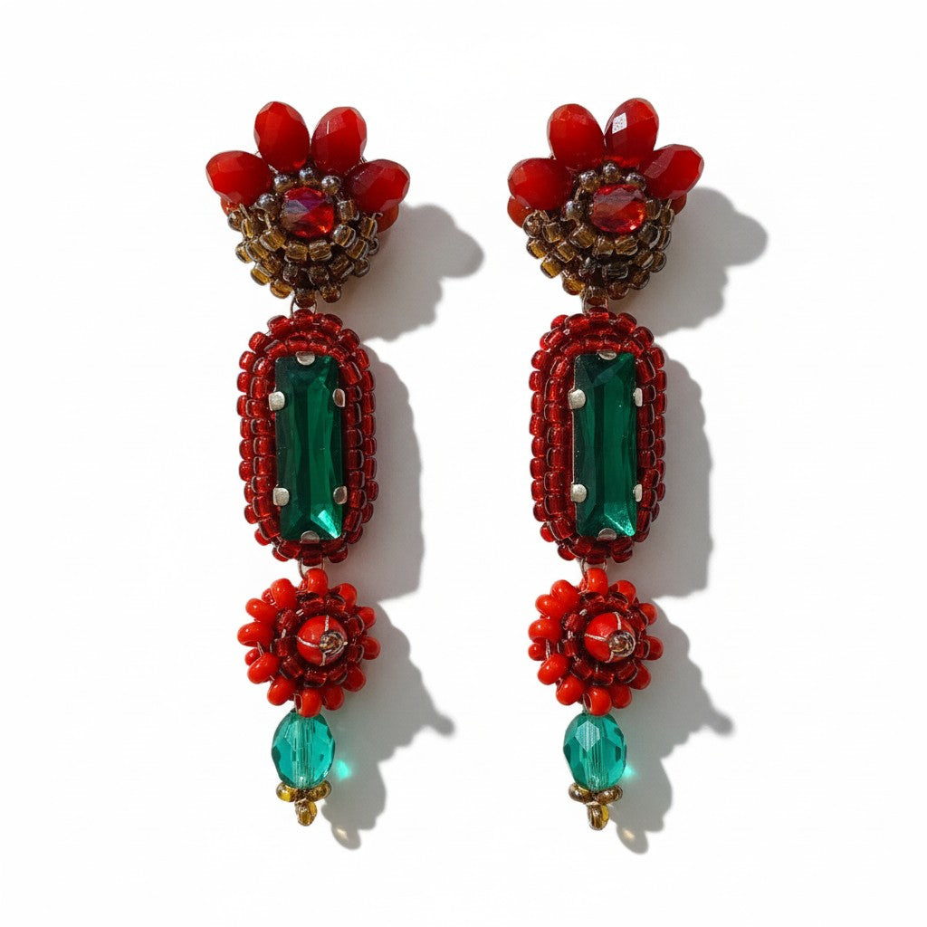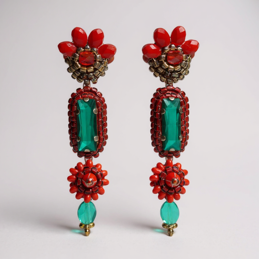 O topo em forma de flor vermelha dá lugar a um elemento central rectangular, semelhante a uma pedra de esmeralda, delicadamente enquadrado por missangas. Na base, uma pequena flor bordada e um cristal verde pendente criam movimento e brilho, tornando estes brincos pendentes perfeitos para festas, jantares ou ocasiões especiais.