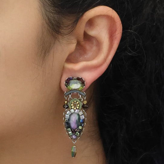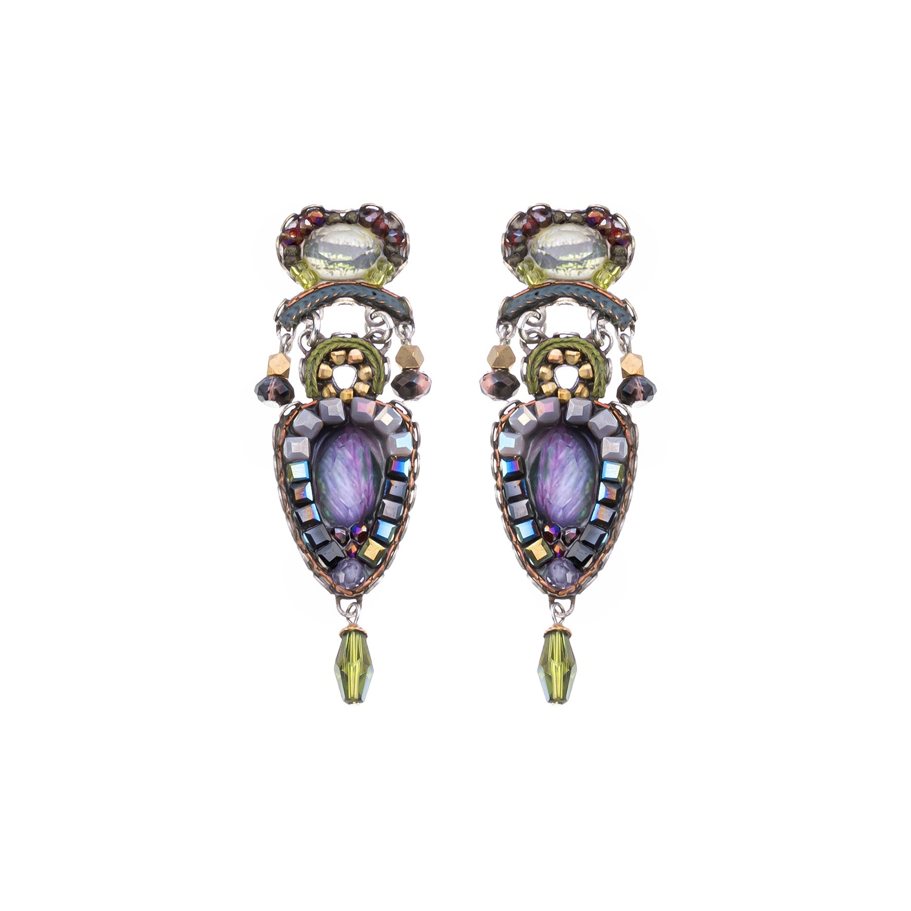 Os brincos Ayala Bar são reconhecidos pela atenção ao detalhe e pela mistura única de texturas. Neste par, o olhar prende-se na lágrima central com reflexos lilás-ameixa, contornada por um delicado mosaico de contas facetadas. Acima, brilhos oliva e dourado dão profundidade, enquanto o pequeno pendente final alonga a silhueta e acrescenta movimento subtil.