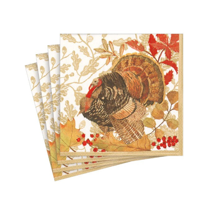 Eleve a decoração da sua mesa com os elegantes guardanapos de papel tripla camada Caspari, com um encantador design de outono com peru, perfeito para celebrações sazonais como Natal, jantares temáticos ou almoços especiais.