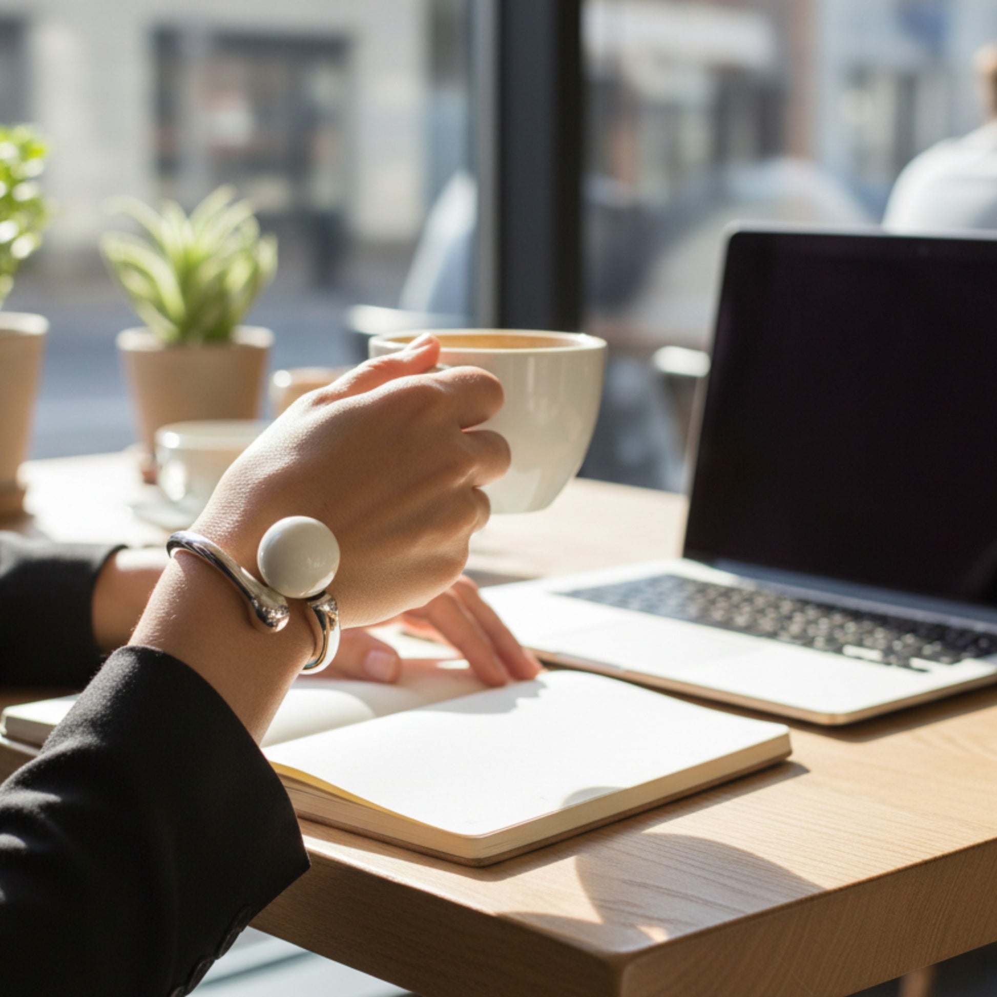 Dê um toque original aos seus looks com esta pulseira prateada rígida em zamac com banho prateado, de design aberto e moderno. O destaque vai para a bola em cerâmica pintada à mão, totalmente amovível, que pode ser trocada conforme a cor da sua roupa.